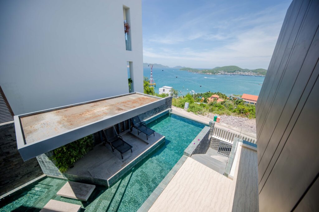 Acqua Villa Nha Trang 3 phòng ngủ (Khu biệt thự biển Anh Nguyễn Oceanfront Villas) gần biển có hồ bơi riêng vô cực view đẹp mới hiện đại cho thuê du lịch nghỉ dưỡng.